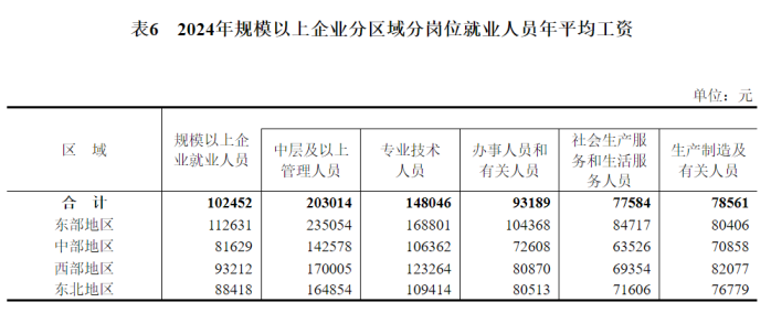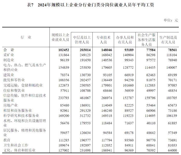 2024年全国城镇非私营单位和私营单位就业人员年平均工资分别为124110元和69476元;规模以上企业就业人员年平均工资为102452元,其中,中层及以上管理人员203014元,专业技术人员148046元,办事人员和有关人员93189元,社会生产服务和生活服务人员77584元,生产制造及有关人员78561元。