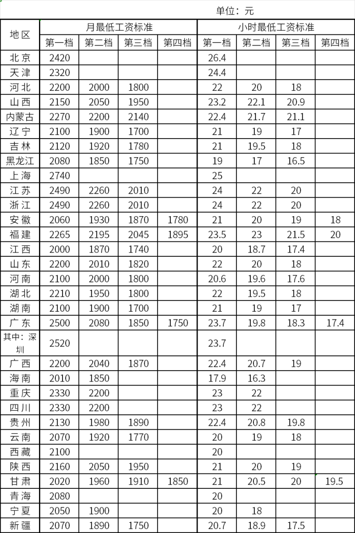 全国各地区最新最低工资标准情况如下: